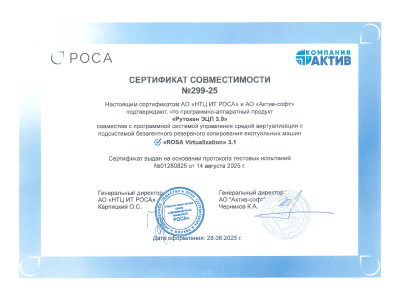 Платформа для создания и управления виртуальной инфраструктурой: серверы, сети и хранилища, автоматизация жизненного цикла ВМ, высокая доступность и миграция с популярных решений. Продукт сертифицирован ФСТЭК России как средство виртуализации 4-го класса защиты.